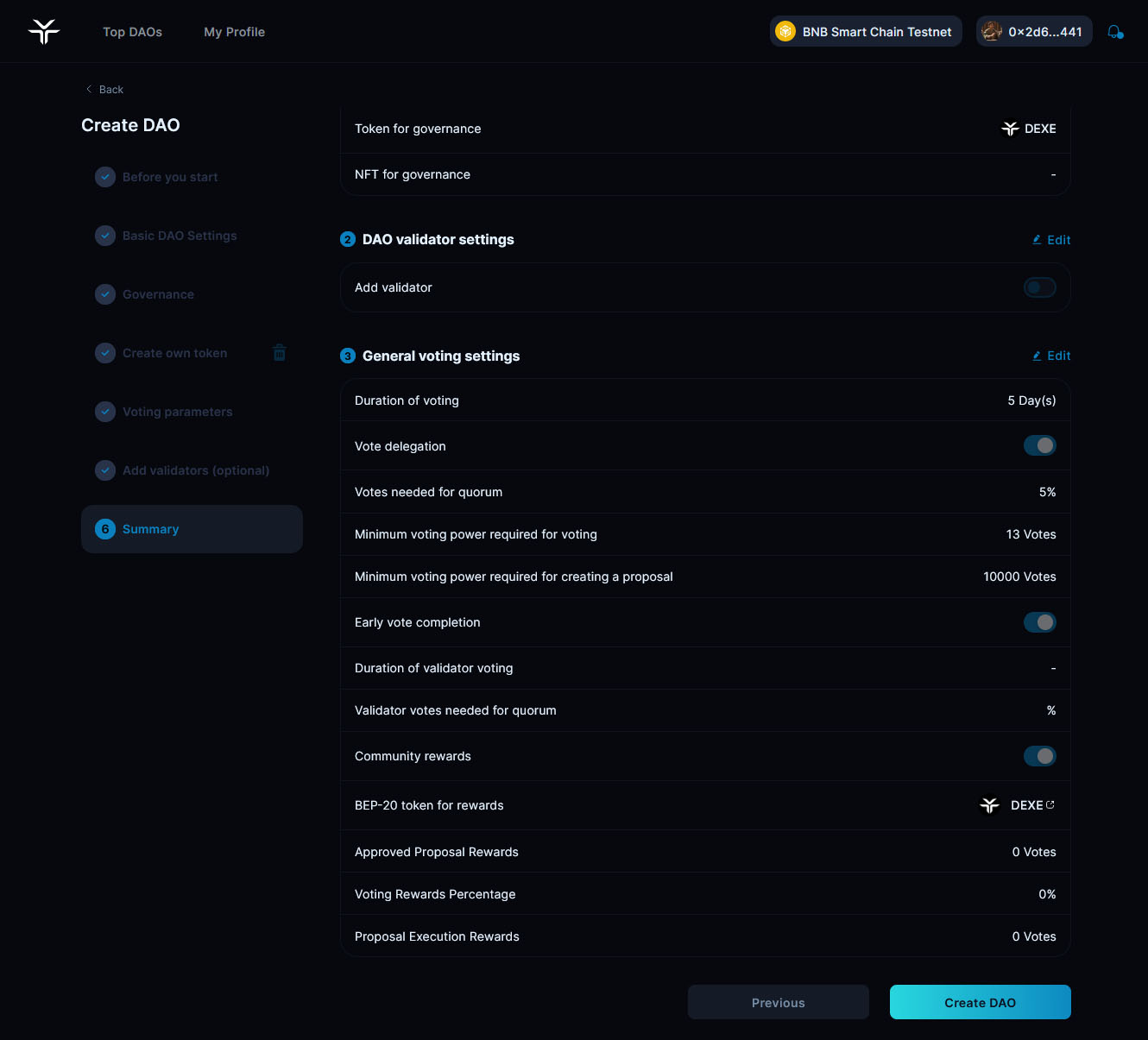 If you need to tweak any settings, simply click "Edit" to re-access each section. All your progress is saved, so no need to start over. Once you're ready, click "Create DAO" to officially deploy it to the selected blockchain.