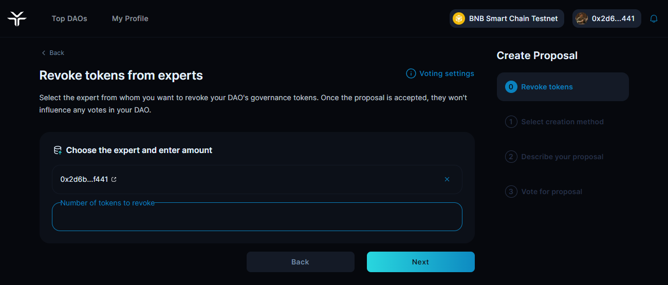 Just as DAO members can delegate their own tokens to experts, granting them voting power, they also retain the ability to revoke those delegated tokens at any time. This allows members to reclaim their voting influence within the DAO as needed.