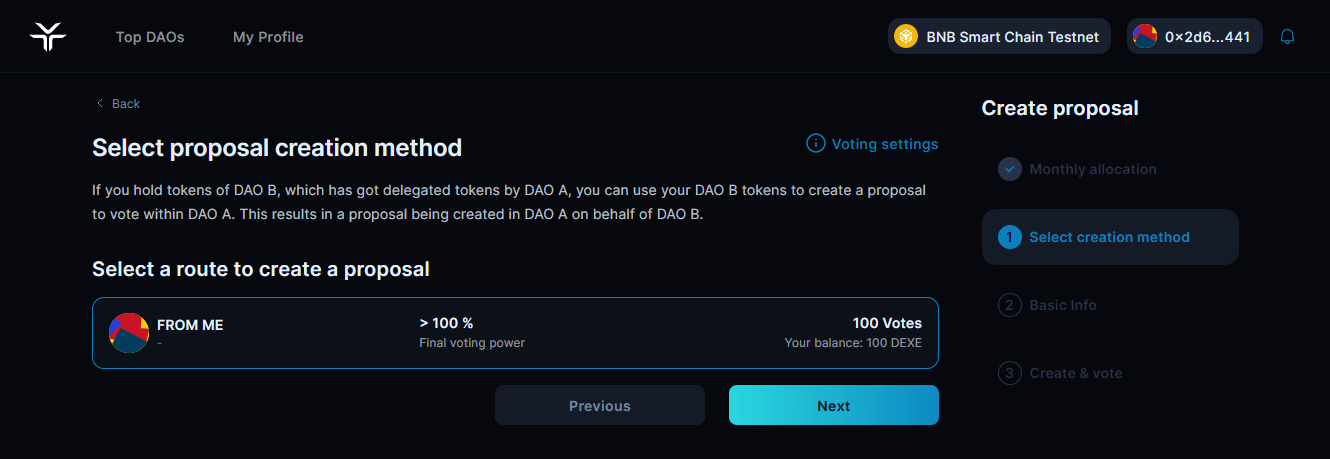 Select if you'll create this proposal directly with your tokens, or use [metagovernance ](https://docs.dexe.io/meta-governance)delegation.