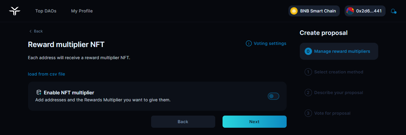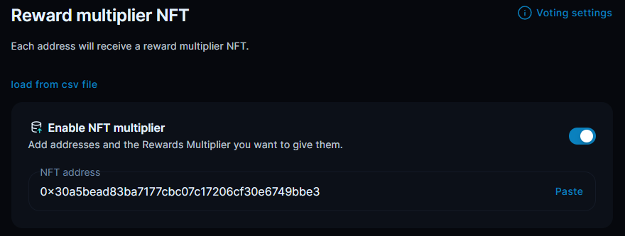 4. **Configure Reward Multiplier** – Set the reward multiplier value that will apply to base rewards for voting and submitting proposals. For example, if the multiplier is set to 2x, NFT holders will earn double the usual rewards compared to non-NFT holders.