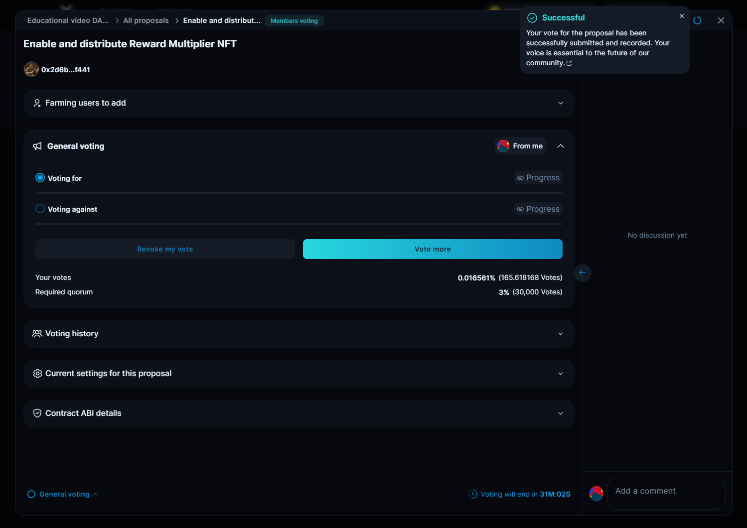 If the quorum is reached, NFTs will be distributed to the recipient's wallets after proposal execution.